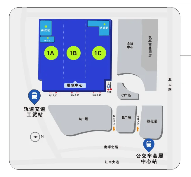 重庆国际会议展览中心矗立于南岸区商业中心核心位置。周边围绕多个商超,离酒店10分钟以内步行距离。通往重庆国际机场只需30分钟高架桥路车程,通往朝天门码头只需20分钟车程,通往火车站也只需10分钟车程,重庆轨道交通3号线在此设站。快速的城市干道和便捷的人行步道有序地设置在国际会展中心周边,为参展商和参观人群提供便利的交通环境。